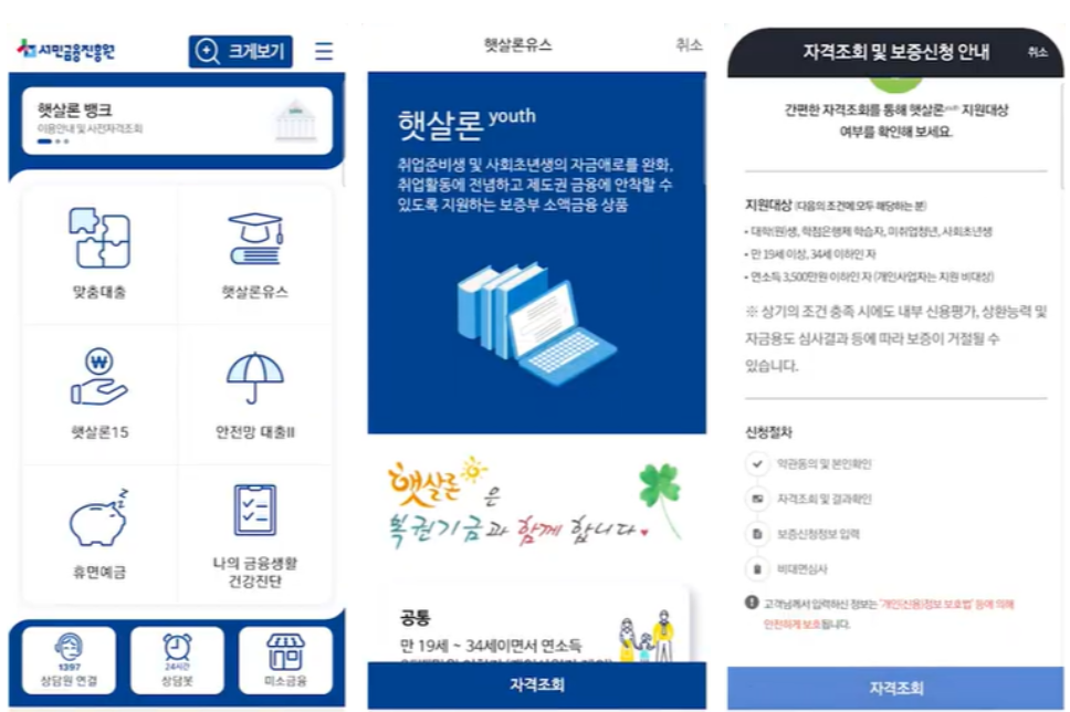 회원가입 및 로그인: 앱에서 회원가입 후 로그인하고, 햇살론 유스 자격조건을 확인한 뒤, 자격조회를 클릭하세요.