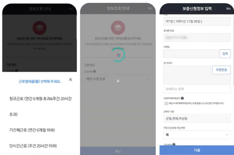 정보 입력: 인증 완료 후, 근로형태 선택, 나이, 소득 등 개인정보를 입력하세요. 건강보험 직장가입자는 '아니오', 대학(원)이나 학점제은행제 재(휴)학 여부는 '네'를 선택하세요.